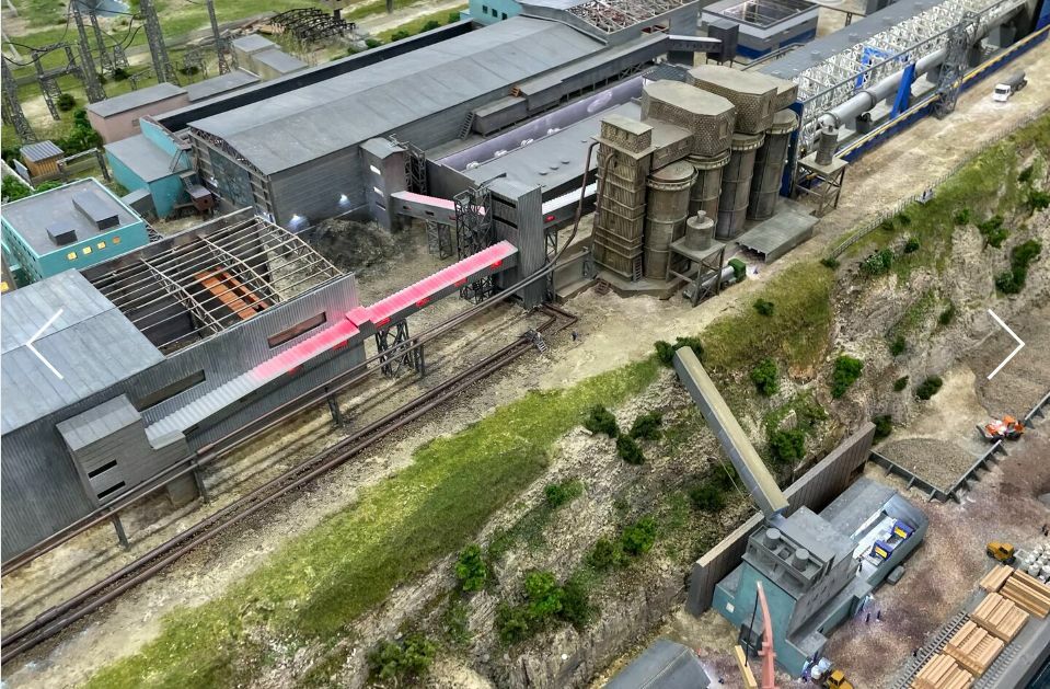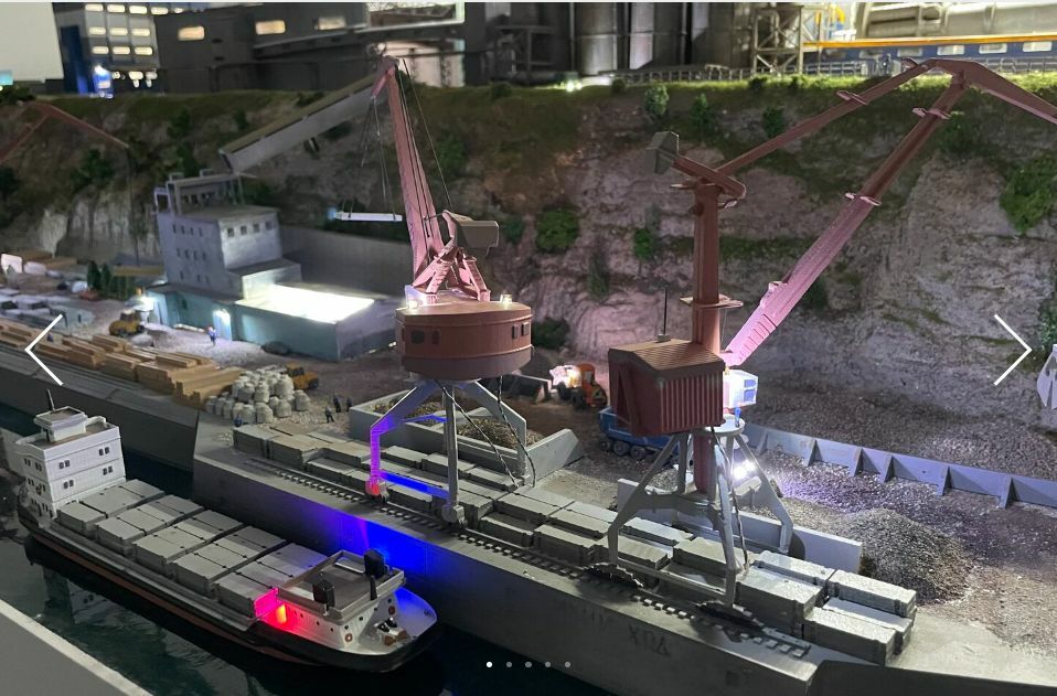 Приедставляем Вам макет речного порта цементного промышленного завода, выполненная с высокой степенью детализации. Можно увидеть различные элементы промышленной инфраструктуры, такие как экскаваторы, подъёмные краны, конвейерные линии, складские помещения и оборудование для транспортировки сырья. Модель расположена на фоне горного рельефа, имитирующего реальный ландшафт реки, крутого берега и скальных пород. Освещение и цветовые акценты подчеркивают масштаб и особенности модели.